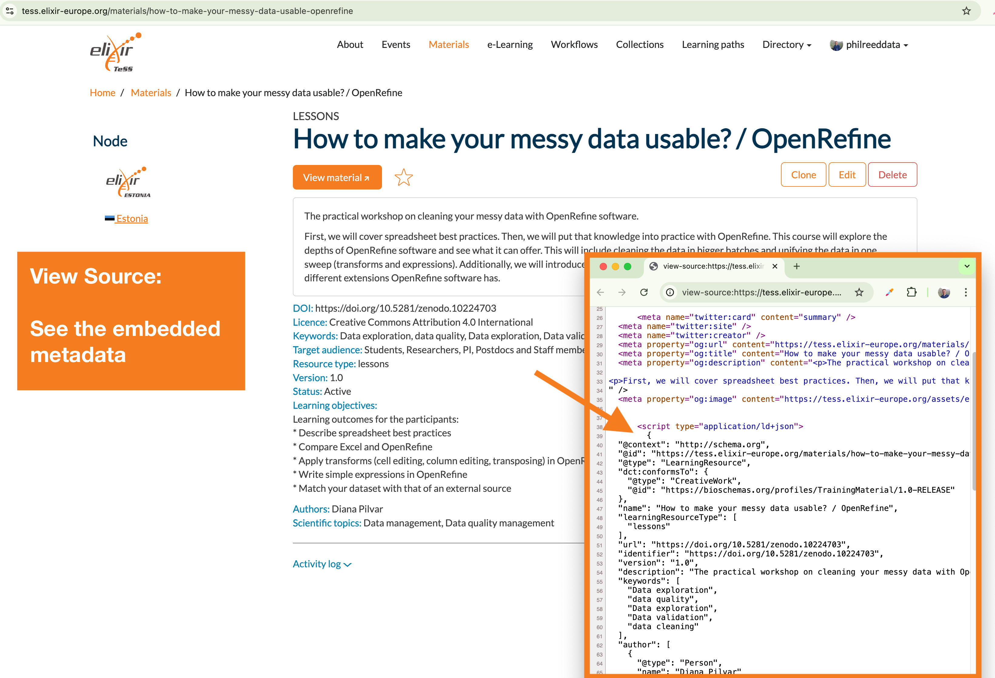 When you view a material or event on TeSS, there is machine-readable metadata behind the human-readable content. If you were to view the HTML source of the page, you would see this code, written as JSON-LD.